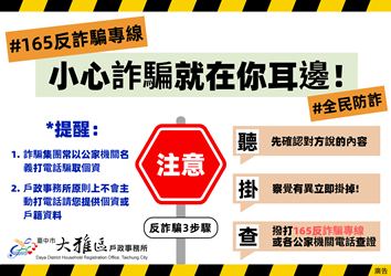 察覺有異請立刻掛掉電話,並撥打【165反詐騙專線】或各戶政事務所查證!