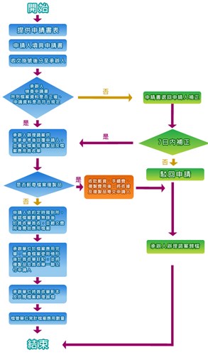 檔案開放作業流程 說明:申請人以書面提出申請,本所收文經業務單位審核並陳核主管,文件不齊者通知七日內補正;陳核不同意者駁回並通知申請人而後結案;陳核同意者通知申請人閱覽檔案或是否郵寄,申請人不閱覽則結案。閱覽者由業務單位陪同閱覽,需影印資料者影印之。最後依規定繳款,歸還檔案並結案