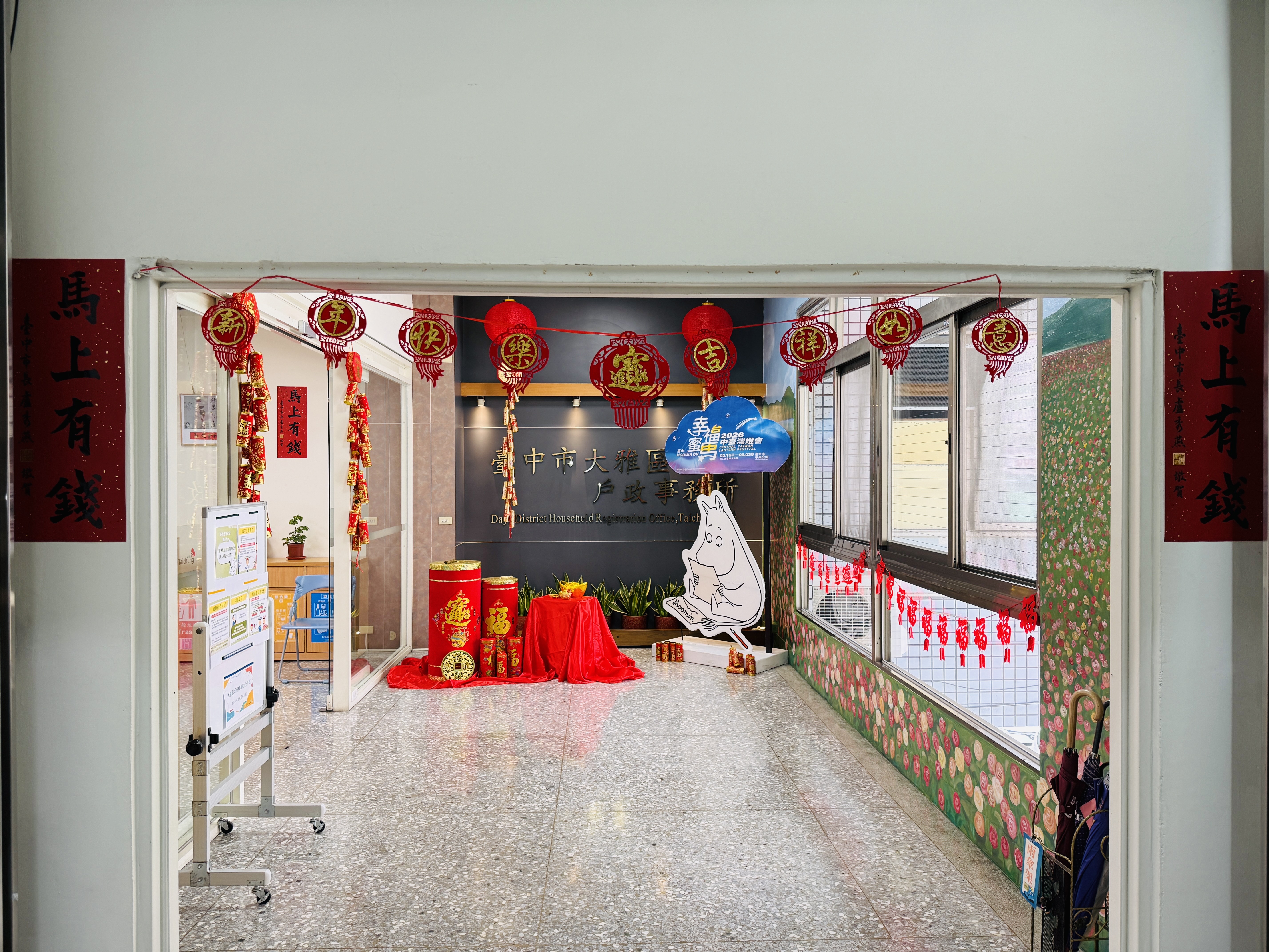 115年馬年到,迎賓入口處懸掛招財進寶掛飾及張貼「馬上有錢」春聯