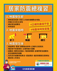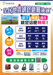 與家人討論及共同參與,實際演練地震避難動作(趴下Drop【固定 Lock】、掩護Cover、穩住Hold on),災害來臨才能減少傷害,確保個人生命財產平安!
