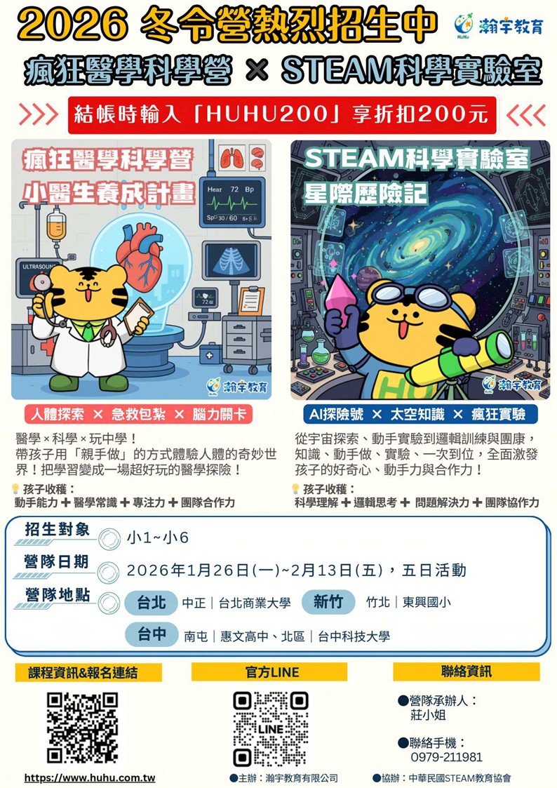 📌更多活動內容及梯次總表,請詳見附件,或搜尋「瀚宇教育冬夏令營」,若需專人服務請洽詢活動方官方LINE(LINE ID搜尋@camphuhu)。