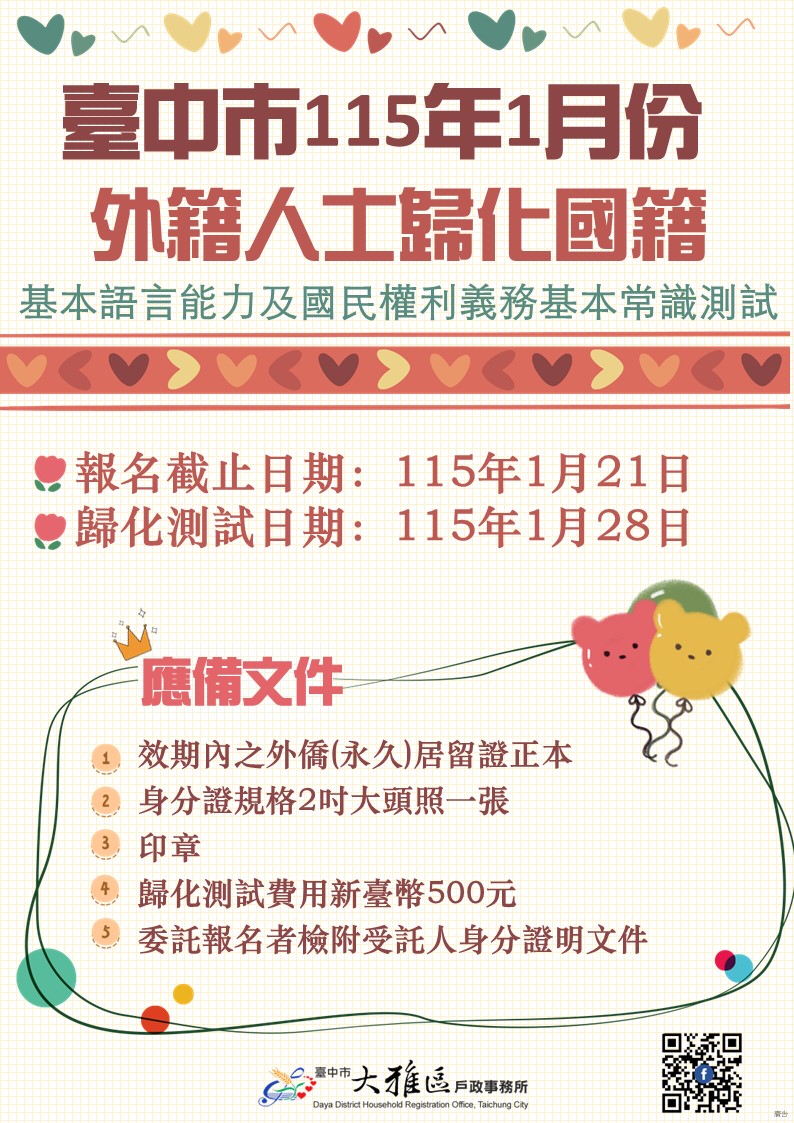 臺中市115年1月份歸化測試,訂於115年1月28日(星期三)由各戶政事務所統一辦理