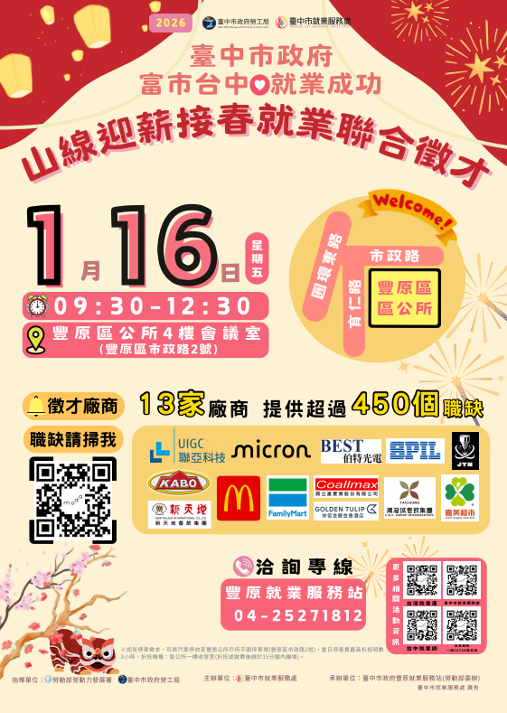 臺中市就業服務處將於1月16日(星期五)上午9時30分至12時30分,在豐原區公所4樓會議室辦理聯合徵才,邀請台灣美光、聯亞科技、全家便利商店及新天地等共13家,提供超過450個職缺,歡迎把握機會踴躍參加,活動詳情請至臺中市就業服務處官網查詢 。