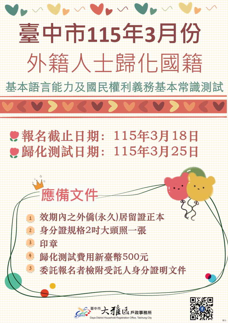 115年3月份臺中市歸化測試,3月25日(星期三)由各戶政事務所統一辦理