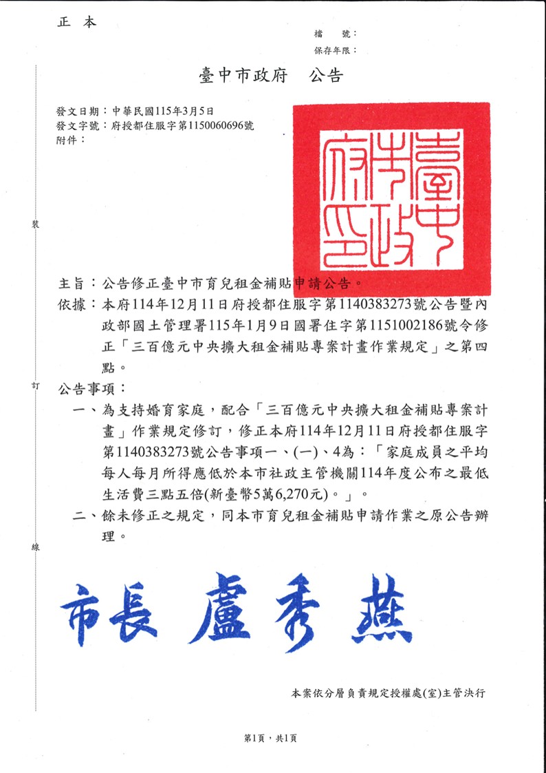 一、為支持婚育家庭,配合「三百億元中央擴大租金補貼專案計畫」作業規定修訂,修正本府114年12月11日府授都住服字第1140383273號公告事項一、(一)、4為「家庭成員之平均每人每月所得應低於臺中市社政主管機關114年度公布之最低生活費三點五倍(新臺幣5萬6,270元)。」。