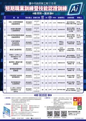 各類職業訓練課程亦可自臺中市政府勞工局網站查詢(路徑:首頁-就業、創業與職業訓練-職業訓練-短期職業訓練-附件下載),詳情可電洽臺中市政府勞工局報名專線:(04)22289111分機35616詢問。